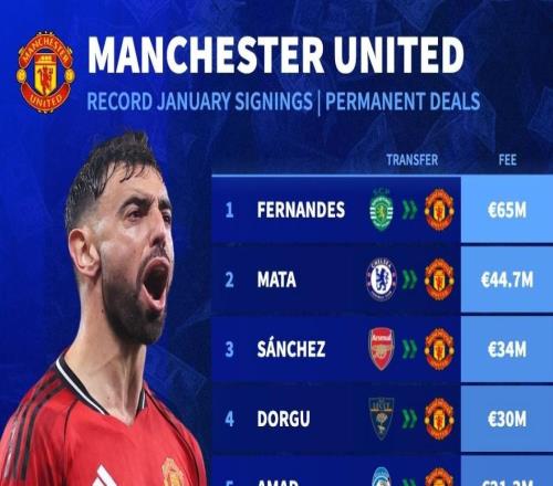 北京时间1月19日,德转统计出了曼联队史冬窗最贵的10笔引援,布鲁诺-费尔南德斯6500万欧元高居第一,马塔4470万欧...
