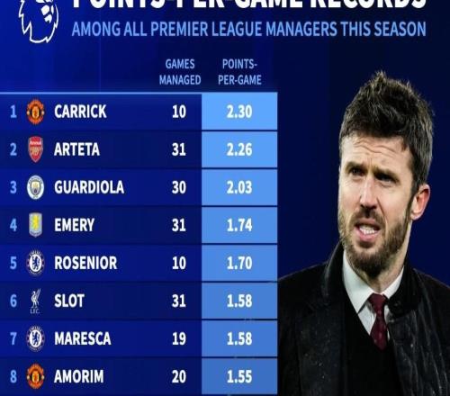 本赛季英超主帅场均积分排名:卡里克2.3分居首,阿尔特塔次席